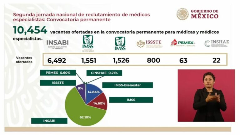 En conferencia de prensa matutina con el presidente Andrés Manuel López Obrador, el titular del IMSS señaló que 6 mil 492 puestos disponibles son del Instituto de Salud para el Bienestar (Insabi); mil 551, del IMSS Bienestar; mil 526, de IMSS ordinario; 800 del ISSSTE; 63, de Pemex y 22, de la Comisión Coordinadora de Institutos Nacionales de Salud y Hospitales de Alta Especialidad (CCINSHAE).