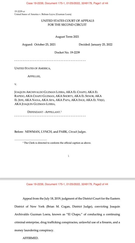 Corte de apelaciones de EU confirma sentencia al ‘Chapo’ Guzmán. Un tribunal de jueces de apelación de Estados Unidos, confirmó este martes la condena de Joaquín “El Chapo” Guzmán, exlíder del Cártel de Sinaloa.
