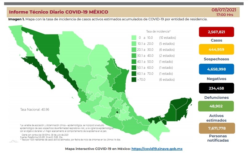 El Reporte Técnico Diario destaca que los contagios confirmados aumentaron en 9 mil 452, con un total de 2 millones 567 mil 821; mientras que los decesos se elevaron 266, para un acumulado de 234 mil 458 en lo que va de la pandemia.