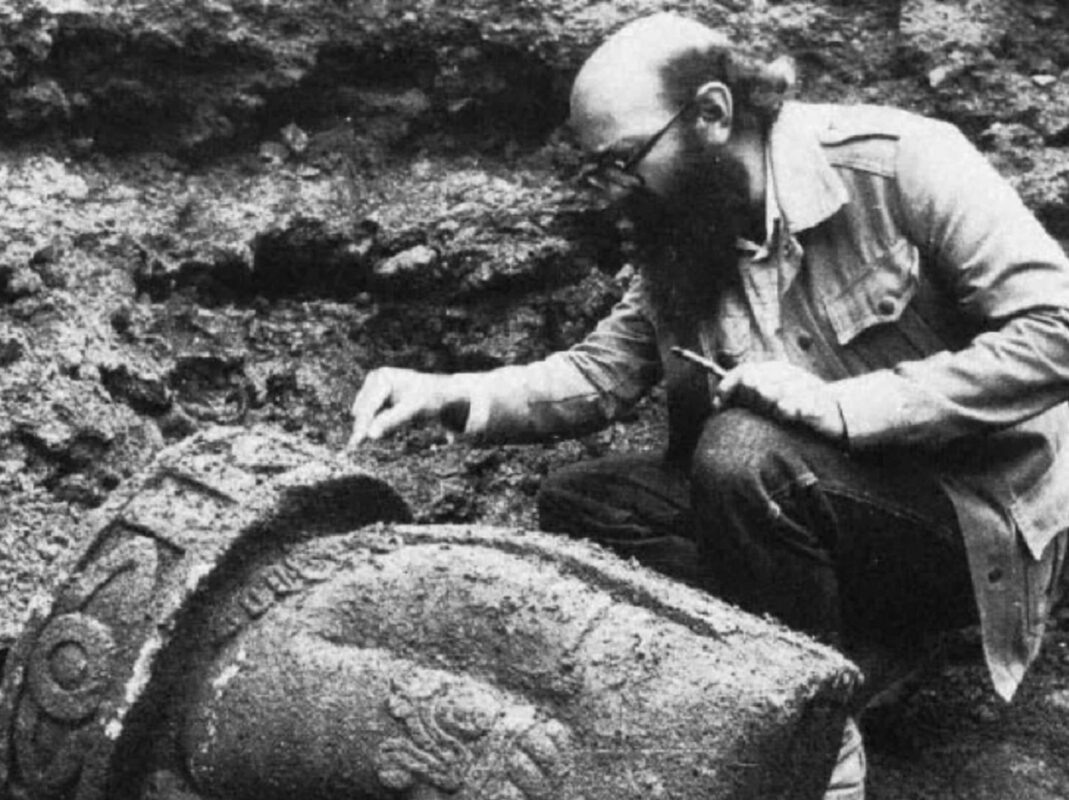 El arqueólogo Eduardo Matos Moctezuma con la escultura del Dios Viejo, en el Templo Mayor. Foto tomada del libro “Arqueología e historia del Centro de México: homenaje a Eduardo Matos Moctezuma”, INAH, 2006.