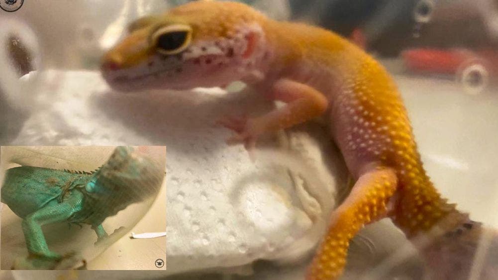 En uno de los envíos decomisado llevaban dos gecko leopardo (es un pequeño y afable lagarto, uno de los más sencillos de mantener en cautividad) y el segundo decomiso, una iguana; en el momento no contaban con la documentación requerida para acreditar su procedencia y traslado.