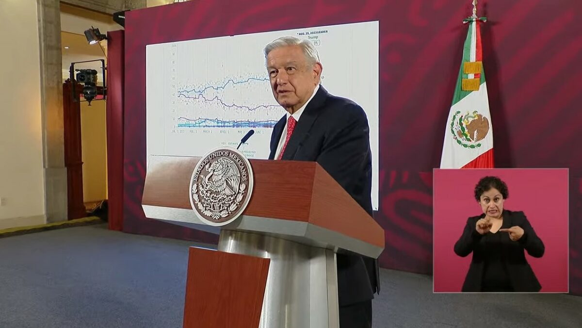 El mandatario pidió presentar una encuesta en la pantalla del Salón Tesorería de Palacio Nacional, en la que pese a tener poca diferencia en enero pasado, la preferencia de la población de ese país sobre DeSantis ha ido en picada, y en la última medición hay un 52 por ciento de preferencia por Trump, ante un 14 por ciento para el gobernador de Florida. Adujo que la baja en su popularidad se debe a la política antimigrante, pese a lo cual no ha cambiado su estrategia.