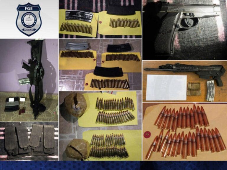 Asimismo, se aseguró ropa táctica camuflada, un arma larga, una arma corta, 254 cartuchos, 25 dosis de marihuana y “cristal”, fundas para pistola, documentos, fotografías, así como mensajes impresos de amenazas y prendas con la leyenda “F.M”.