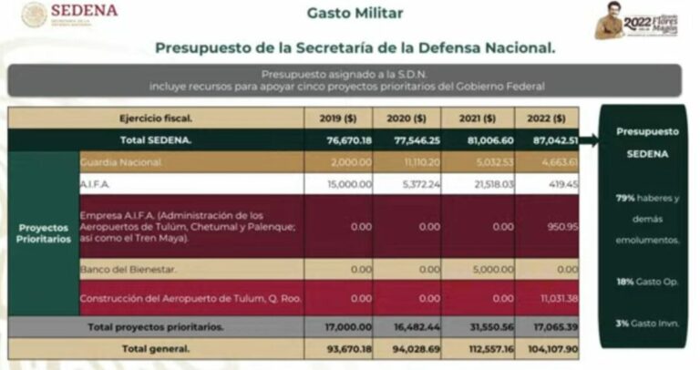 Primero, aclaró que del 100% del presupuesto que se tiene asignado en la Sedena, el 79% corresponde al pago del personal, el 18% se va a gastos de operación, mientras que el 3% de ese presupuesto es lo que queda para gastos de inversión, mismo del que se pueden adquirir los equipos que se requieren para seguir operando.
