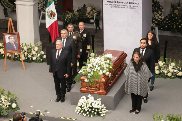 Después de sus palabras, el mandatario estatal, junto con la esposa de Miguel Barbosa, sus hijos y miembros del Gabinete, encabezó una de las primeras guardias de honor al lado del féretro de Miguel Barbosa Huerta.