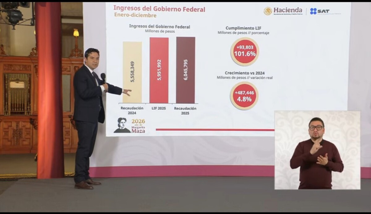 Respecto a los ingresos por recaudación exterior en aduanas, el funcionario detalló que en 2025 se recaudaron 1,449,458 millones de pesos, es decir, 16% más que en 2024.