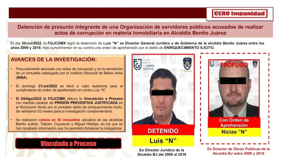 Por tales hechos, se logró ubicar a la organización de servidores públicos acusados de realizar actos de corrupción en materia inmobiliaria en la Alcaldía Benito Juárez, por los cuales ya fueron detenidos en cumplimiento con una orden de aprehensión en su contra por el delito de enriquecimiento ilícito.