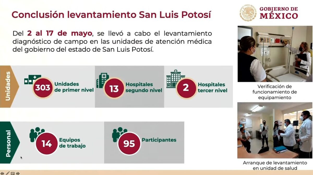 Del 2 al 17 de mayo se realizó el levantamiento diagnóstico de campo en las unidades de atención médica en 303 unidades de primer nivel, 13 hospitales de segundo nivel y dos hospitales de tercer nivel con la participación de 95 servidores públicos en 14 equipos de trabajo.