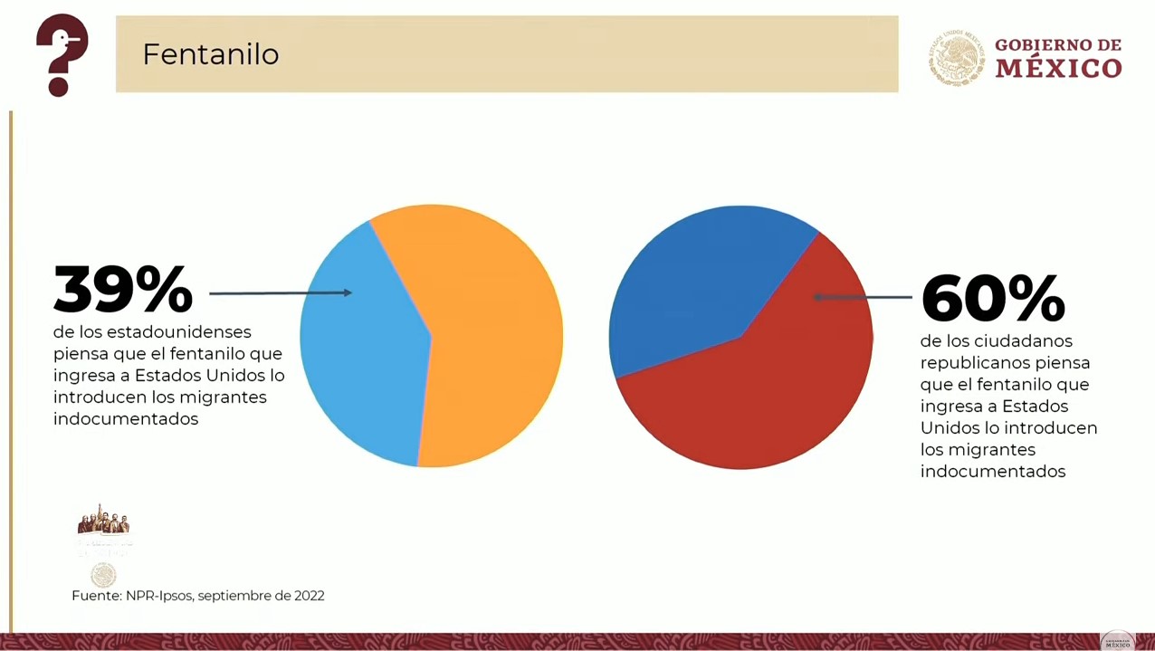 El mandatario comentó que, según la encuesta de NPR-Ipsos en 2022 el 39 por ciento de los estadounidenses sostuvo que el fentanilo lo introducen los migrantes; ante estas creencias defendió que las personas que buscan llegar a Estados Unidos lo hace para acceder a mejores oportunidades de vida y trabajo.
