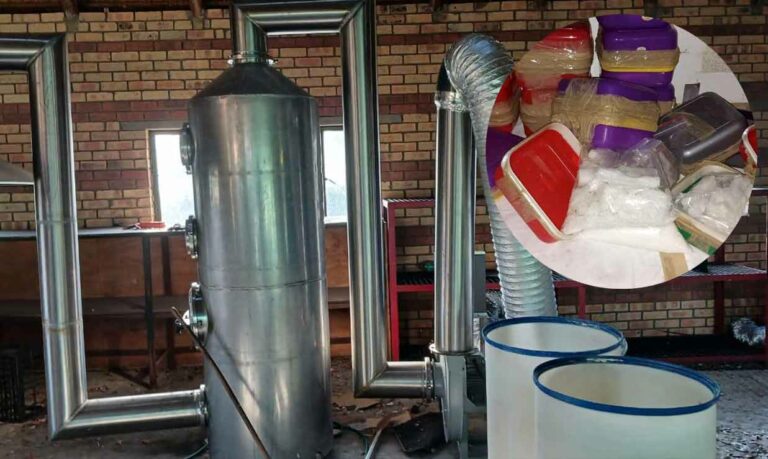 Las autoridades también incautaron metanfetamina ya procesada, empacada en loncheras y cubos almacenados en congeladores, con un valor estimado de 350 millones de rands —aproximadamente unos 20.2 millones de dólares.