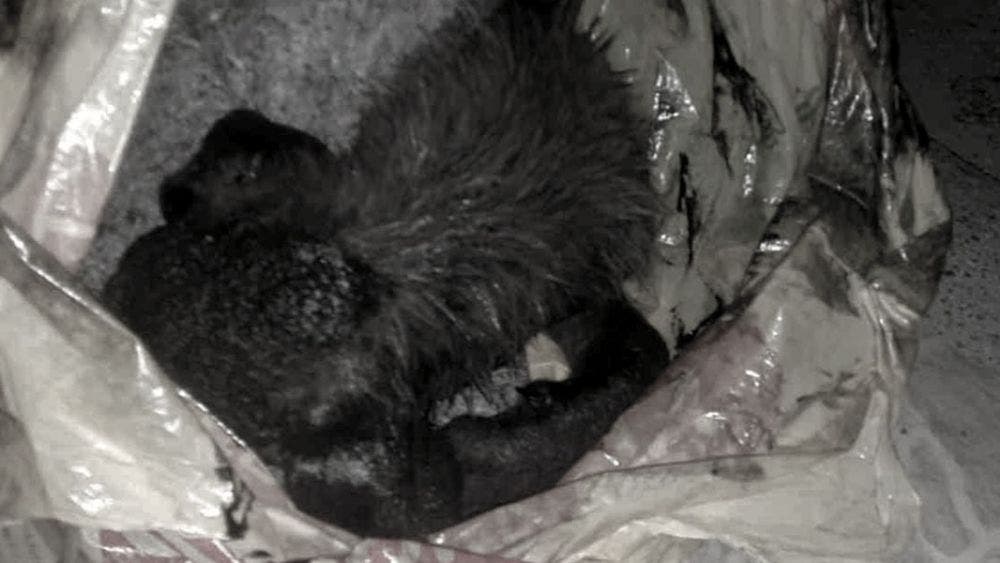 Rápidamente bajó y encontró a otro perro quemado y lleno de aceite y pensó que también estaba muerto, pero al sacarlo del costal, se percató de que aún estaba vivo.
