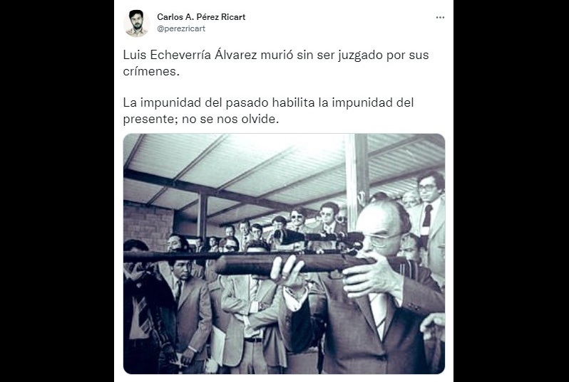 Por su parte, Carlos Pérez Ricart, integrante de la Comisión para el Acceso a la Verdad, el Esclarecimiento Histórico y el Impulso a la Justicia de las violaciones graves a los derechos humanos cometidas de 1965 a 1990, también lamentó que Echeverría Álvarez “murió sin ser juzgado por sus crímenes”.
