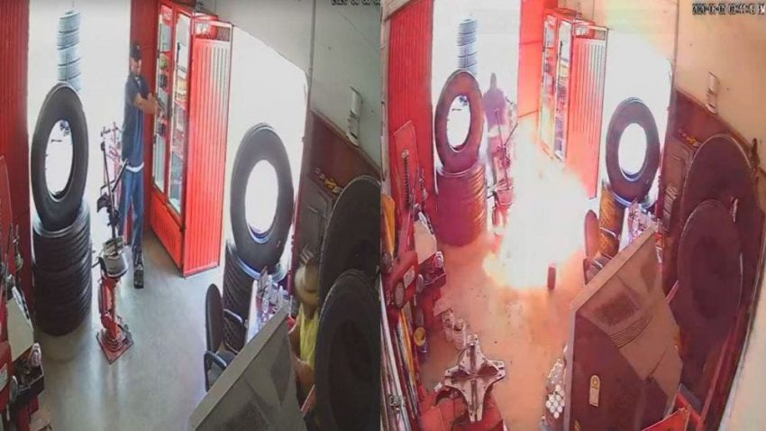 En un video muestran, como uno de los sujetos vacía el combustible en el suelo y le prende fuego. Todo ocurre en un lapso de 30 segundos. Su cómplice corre hacia la parte trasera del taller en donde también dispara a uno de los trabajadores del lugar.