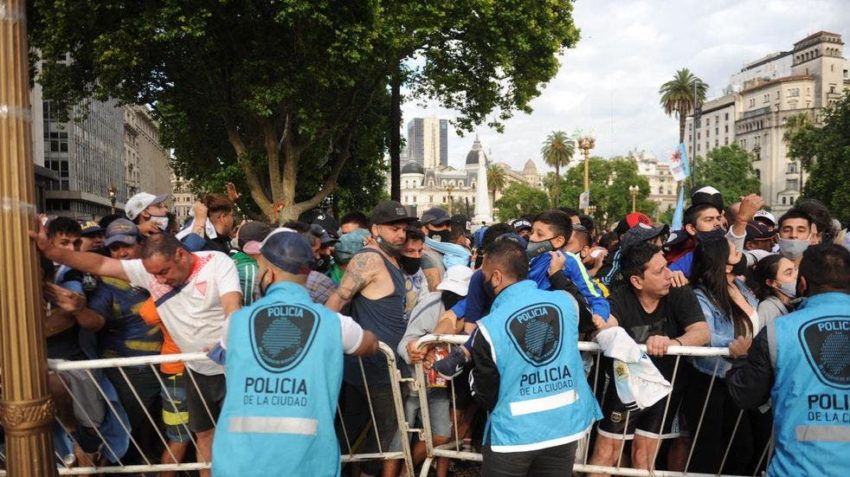 Esta mañana, miles de personas realizaban una extensa fila entre vallas sin distanciamiento social y muchas de ellas sin una máscara facial, para poder entrar a la Casa Rosada a despedir a su ídolo que falleció ayer a los 60 años de edad, tras sufrir una insuficiencia cardiaca; esto a pesar de la pandemia que se vive por el miedo al Covid.