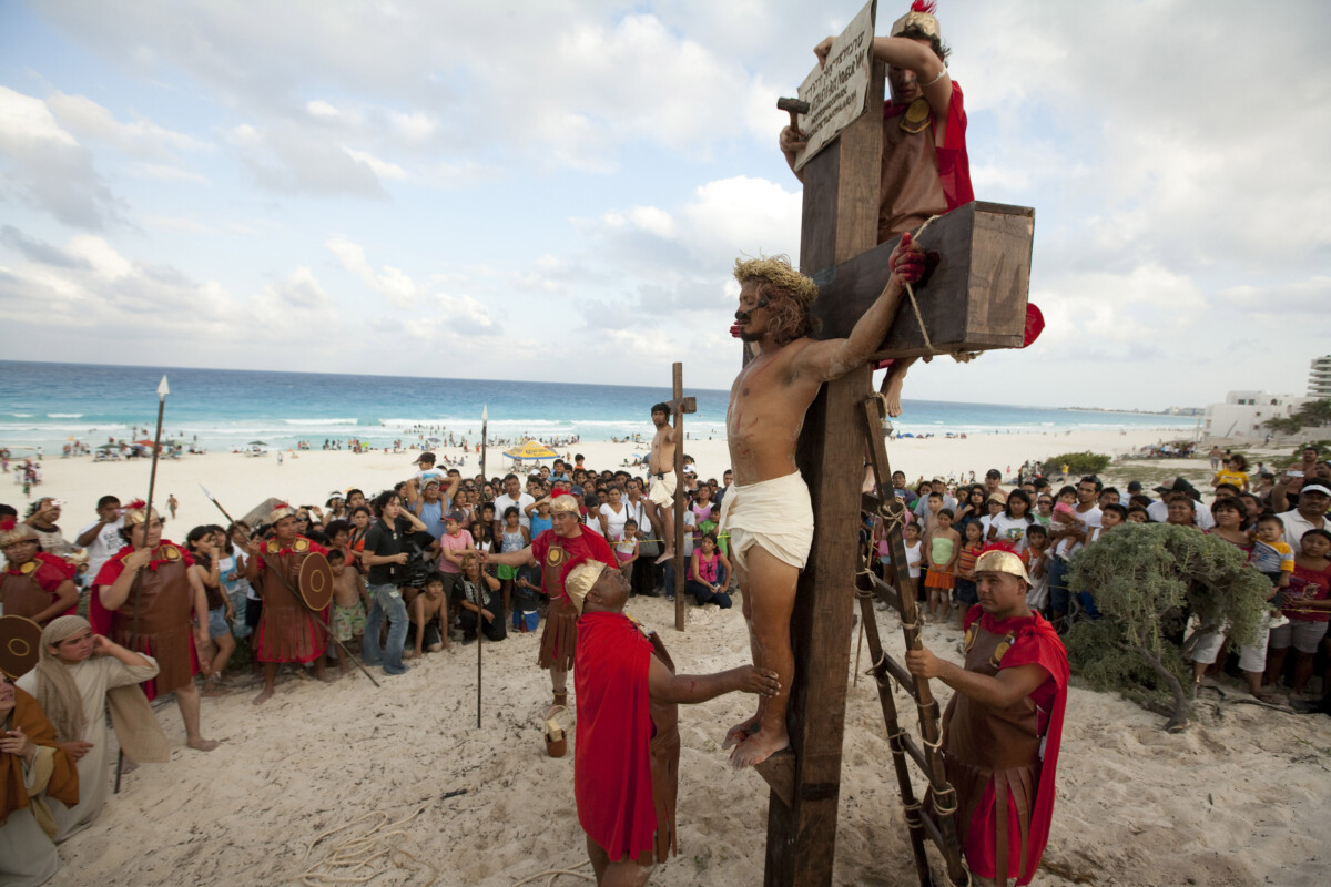 Representación del Vía Crucis en las playas de Cancún; Ricardo “el Sordo”, ex adicto, interpretó a Jesús junto con otros 120 participantes entre actores y organizadores.