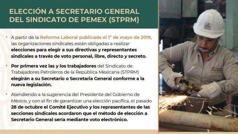 La secretaria del Trabajo, Luisa María Alcalde, informó sobre las elecciones de los líderes sindicales de Pemex mediante el voto personal, libre, directo y secreto, lo cual se realiza por primera vez.