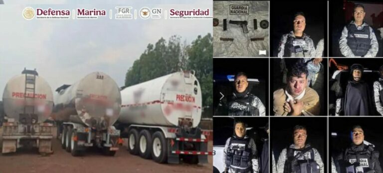 Asimismo, en Salamanca, Guanajuato, fuerzas federales y estatales detuvieron a nueve personas presuntamente vinculadas al robo de hidrocarburos, tras un operativo en el que se ejecutaron cuatro cateos y se aseguraron decenas de vehículos, armas y 27 mil litros de asfalto.