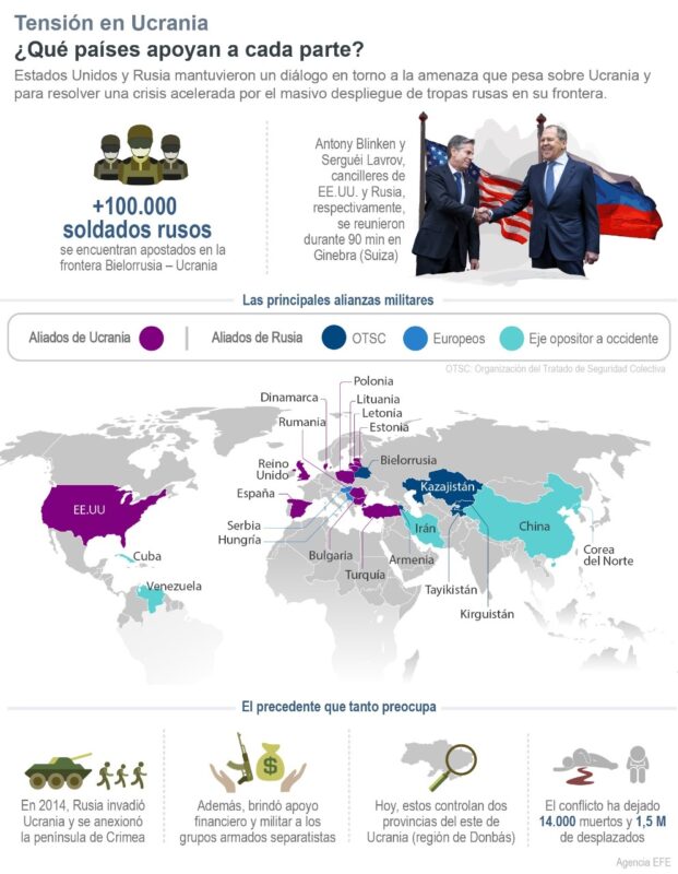 Horas antes, la vocera de la Casa Blanca, Jen Psaki aclaró que “no vamos a estar en una guerra con Rusia o poner tropas militares en Ucrania para luchar”, mientras el vocero del Pentágono, John Kirby, aseveró que Washington no tiene planes para aumentar la presencia militar permanente en el flanco oriental de la OTAN, y explicó que “de lo que estamos hablando ahora es de redistribuciones (de tropas) temporales y a corto plazo”.
