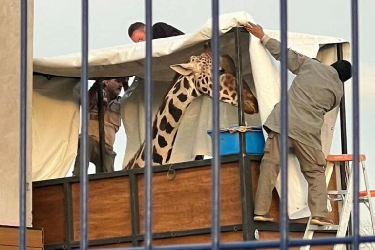 La expectación era máxima. Una grúa levantó con extremo cuidado el contenedor con la jirafa hasta el camión mientras algunos habitantes y activistas se despedían de un animal que conquistó los corazones de la ciudad: “Te queremos Benito”.