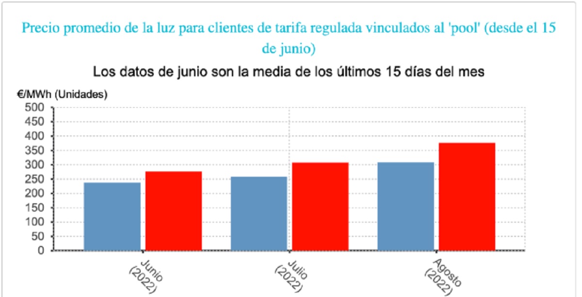 El precio promedio de la luz para los clientes de tarifa regulada vinculados al mercado mayorista ha registrado en agosto su nivel más alto para un mes en la historia, con una media de 307.8 euros por megavatio hora (MWh).