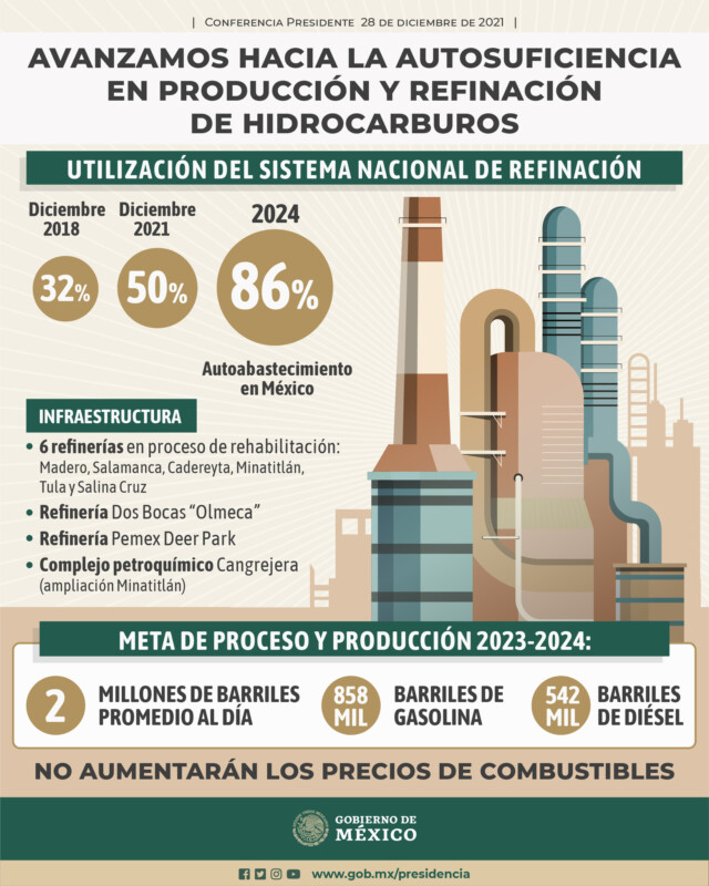 En 2024 se llegará a la meta de producir 2 millones de barriles diarios de petróleo, pero no se rebasará esa cifra, porque “aunque tenemos yacimientos para extraer más, con esta producción podemos abastecer nuestras refinerías y lograr el propósito de la autosuficiencia, no vender crudo, sino procesarlo”, afirmó este viernes el presidente Andrés Manuel López Obrador.