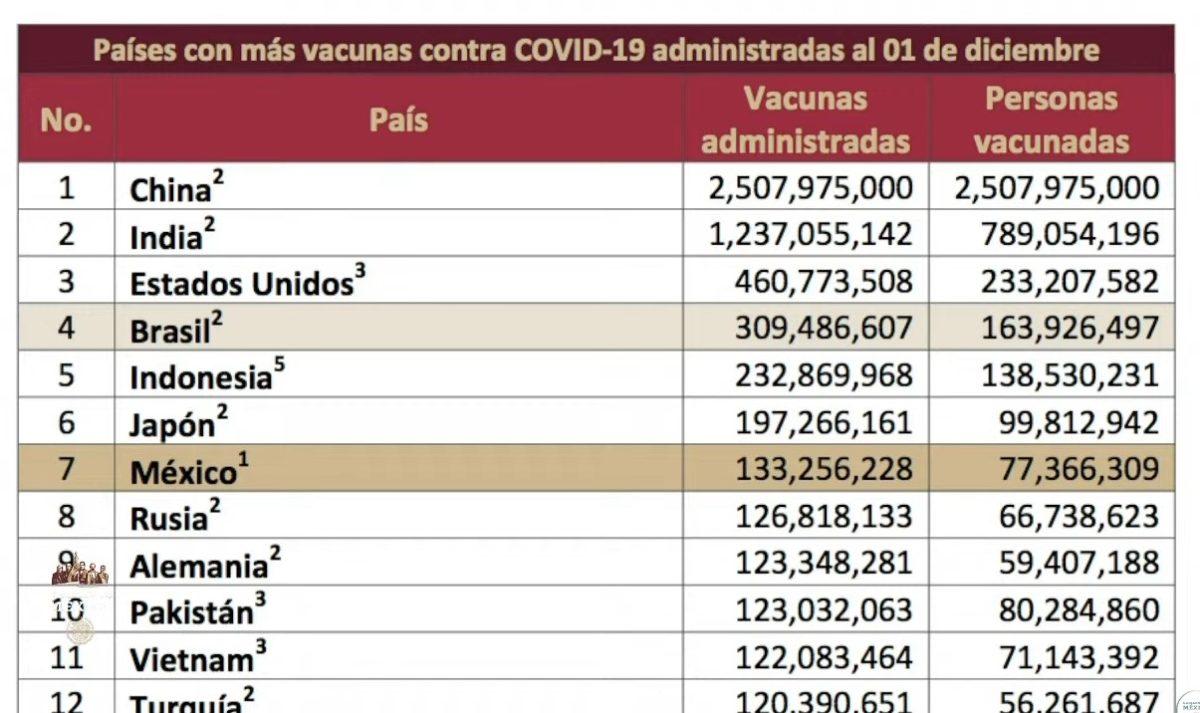 El Presidente mostró una tabla en la que México aparece en los primeros sitios en cuanto a disponibilidad y aplicación de vacunas.