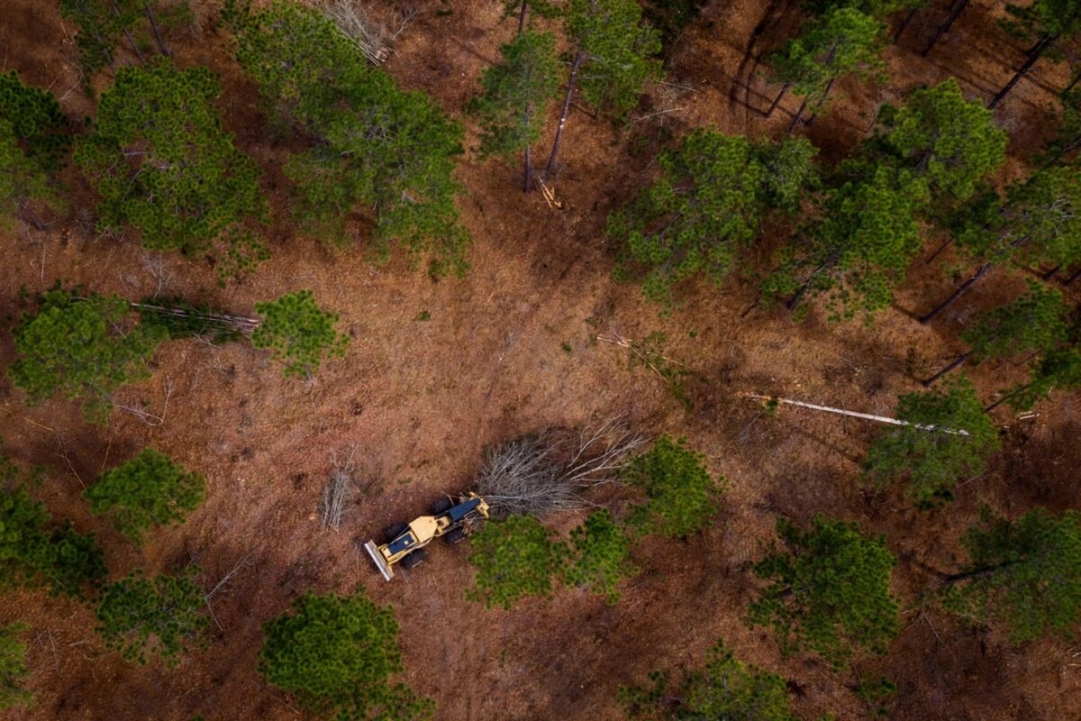 Las ramas de árboles son arrastradas hasta una trituradora, destinadas a convertirse en pélets de madera que produce una fábrica cercana de Enviva, en el condado de Moore, en Carolina del Norte, EU; similar a lo que hace Europa hoy en día.