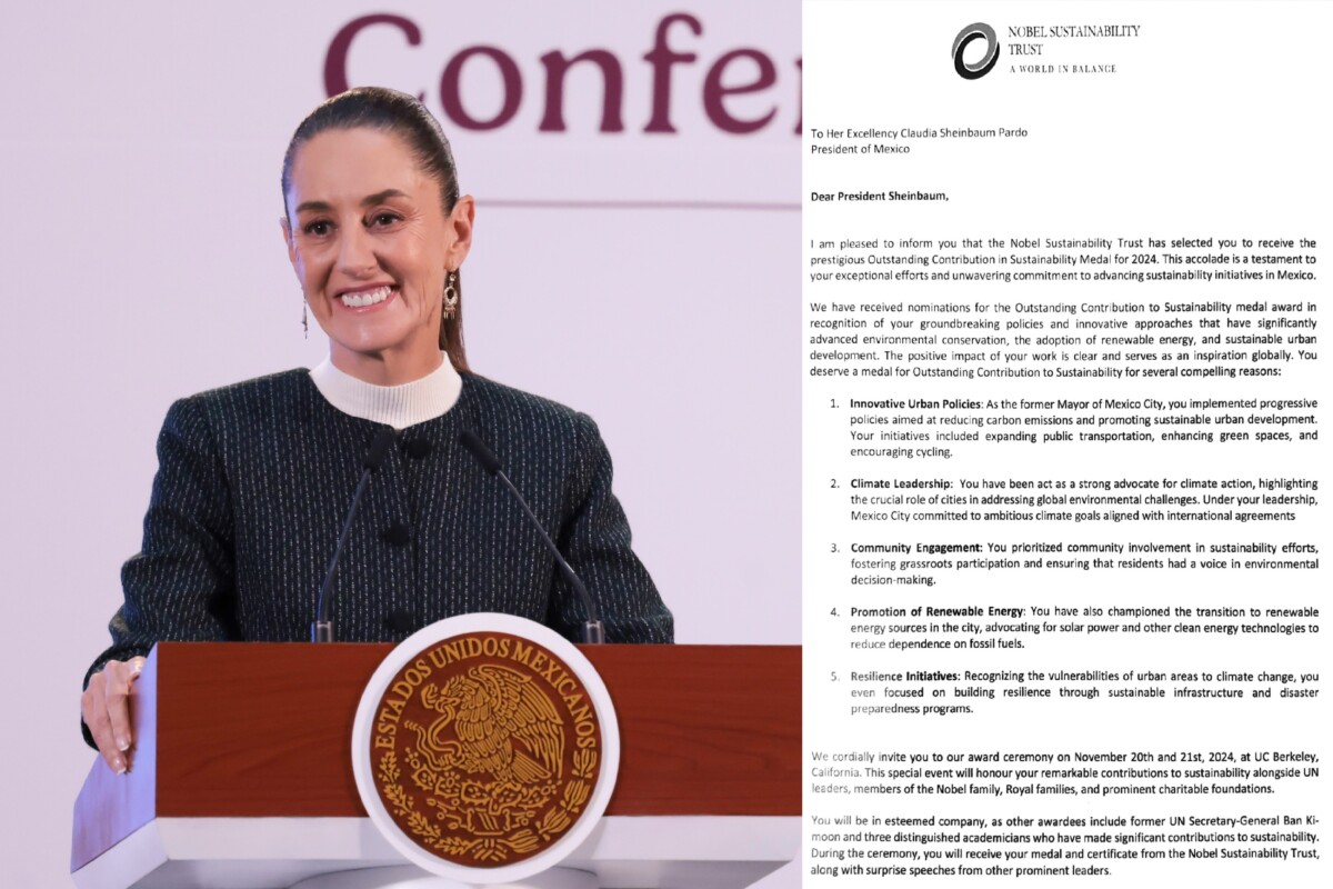 En su cuenta de X, señaló que el Nobel Sustainability Trust resolvió, con el apoyo de las universidades de Munich y California, entregar el galardón a la primera Presidenta de México por sus proyectos en la capital del país, entre ellos, el Cablebús, la rehabilitación del Bosque de Chapultepec y la planta fotovoltaica de la Central de Abasto (Ceda), considerada la más grande del mundo dentro de una ciudad, según datos del Gobierno de la Ciudad de México, por mencionar algunos.