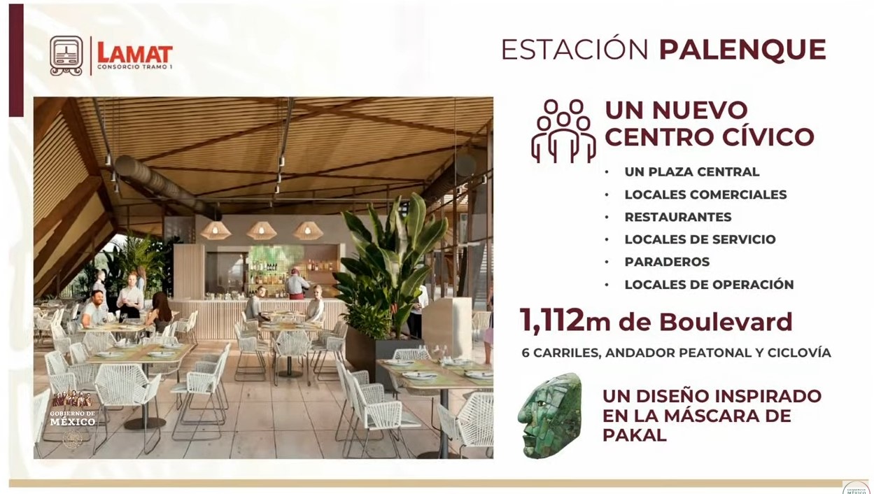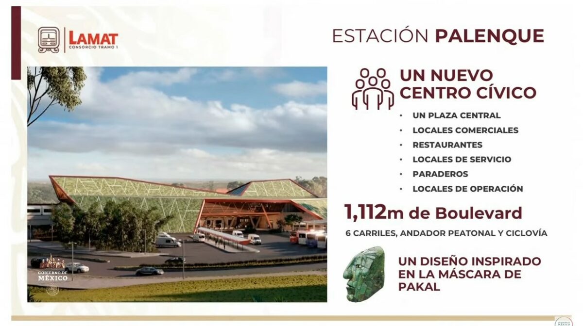 Esta estación “significa todo lo que es el Tren Maya: la integración social y cultural, integración con todo el patrimonio arqueológico. La estación fue construida, está siendo diseñada, con base en el diseño de la máscara de Pakal, toda la estación va a tener espacio de miles de metros cuadrados donde vamos a tener un centro cívico de Palenque con la estación del Tren Maya, una integración de la experiencia del usuario del tren con la experiencia de la integración cultural y arqueológica de las zonas que vamos a visitar. Van a ser más de mil metros lineales de boulevares, va a tener ciclovía y andador peatonal. La estación de Palenque es en sí misma una obra de arte dentro de todas las obras que compone Tren Maya tramo uno”.