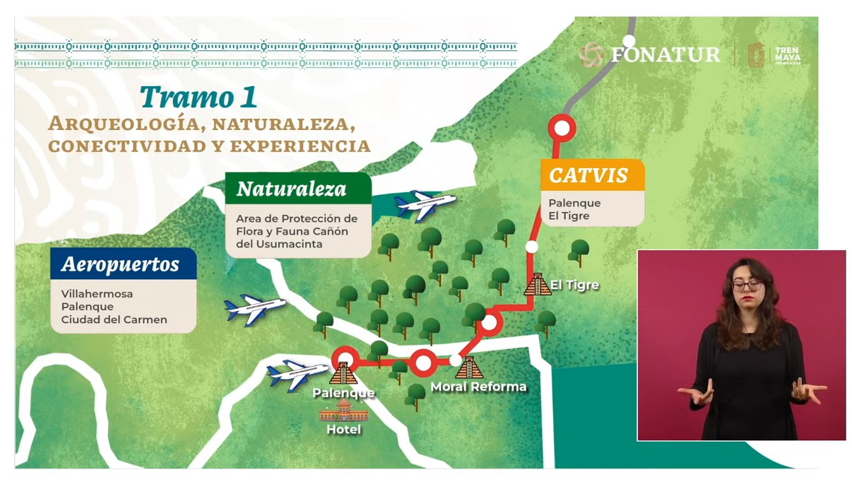 Javier May, titular del Fondo Nacional de Fomento al Turismo, detalló esta mañana en la conferencia presidencial que este tramo tendrá 226 kilómetros y atraviesa por tres entidades: Chiapas, Tabasco y Campeche. Y gracias a éste se trabaja en el mejoramiento de tres zonas arqueológicas: Palenque, en Chiapas; Reforma del Moral, en Tabasco; y El Tigre, en Campeche.