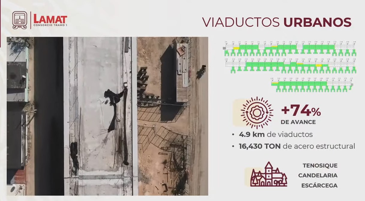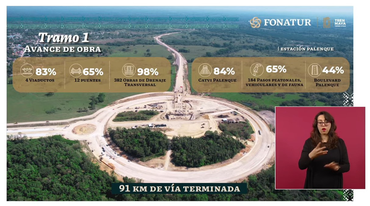 El funcionario indicó que en esta fase se tendrán cuatro viaductos en los que ya se tiene un avance de 83 por ciento y 12 puentes con un avance en su construcción de 65 por ciento; se está rehabilitando el aeropuerto internacional de Palenque, casi están terminadas las 382 obras de drenaje transversal y el centro de atención a visitantes de la zona arqueológica de Palenque tiene un avance de 84 por ciento.