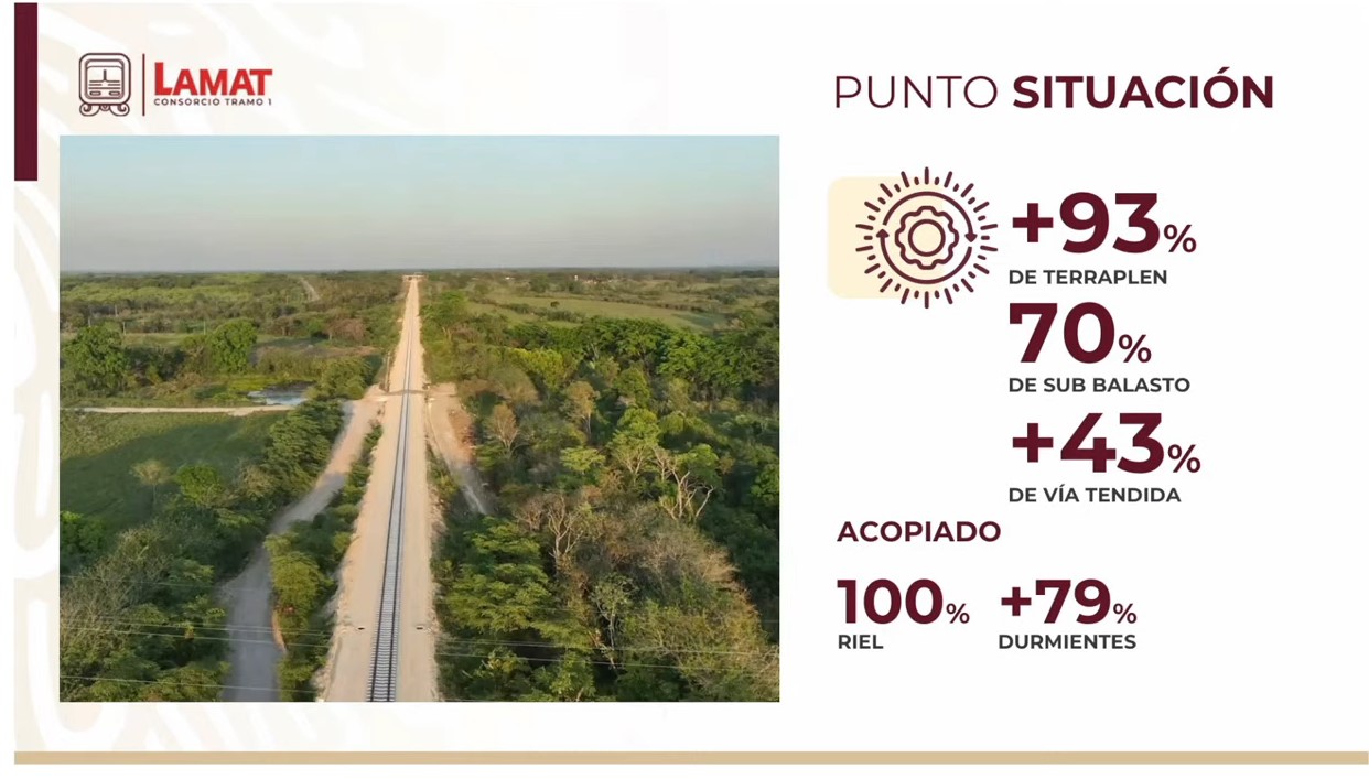 May indicó que en este tramo del proyecto ferroviario del presidente Andrés Manuel López Obrador ha generado 13 mil empleos, y se cuenta ya con el 100 por ciento del riel requerido, 89 por ciento de durmientes y 65 por ciento de balasto.
