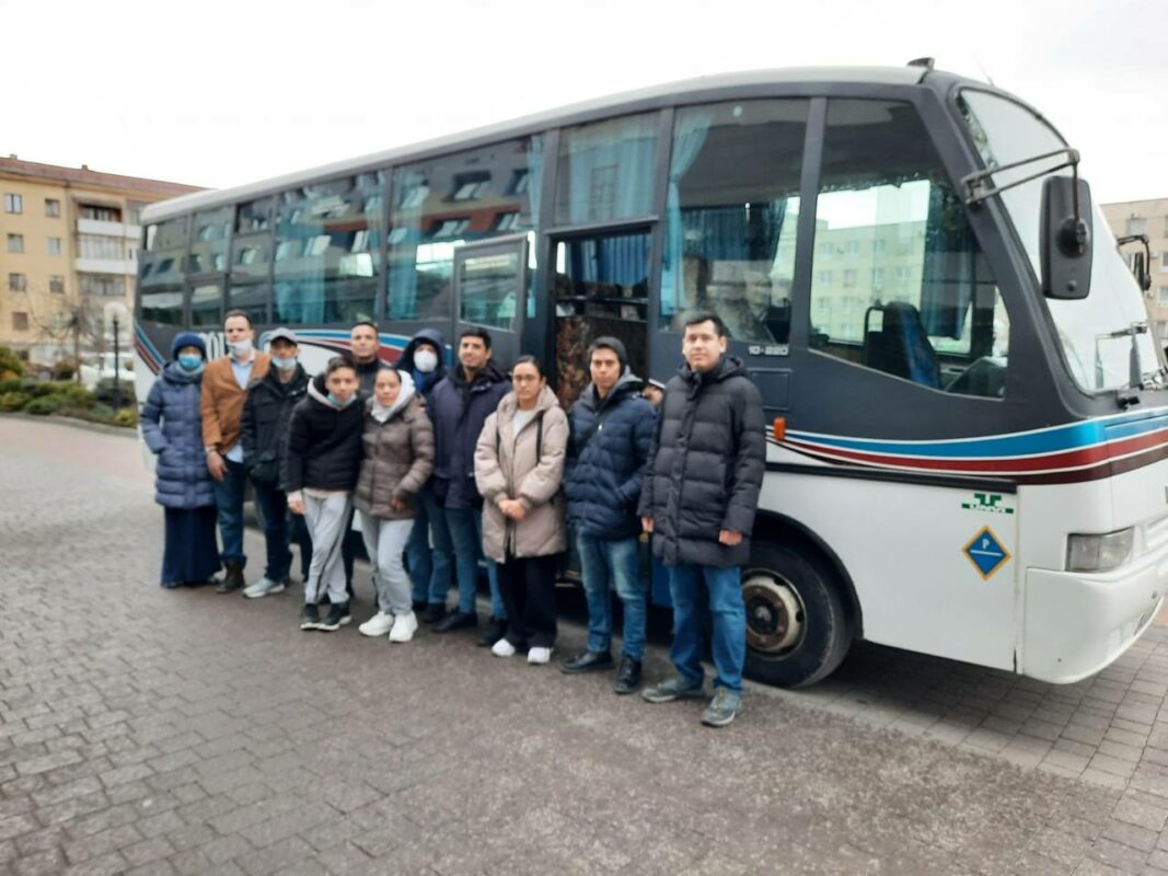Autobús saliendo de Ivano-Frankivsk rumbo a Rumania con mexicanos apoyados por el protocolo de protección a cargo de nuestras embajadas en Ucrania y Rumania.
