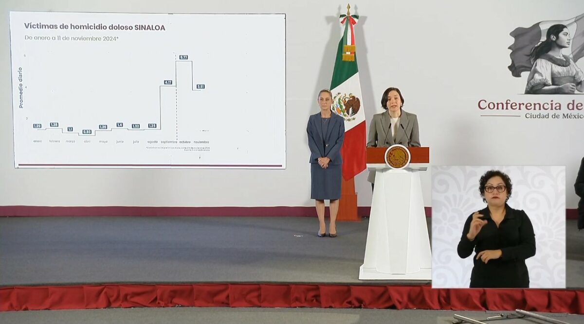 Respecto a la situación actual en Sinaloa, explicó que entre enero y agosto de 2024 se registró un promedio de homicidios dolosos diario estable de 0.93 en abril, mientras que el más alto fue en junio con 1.4.