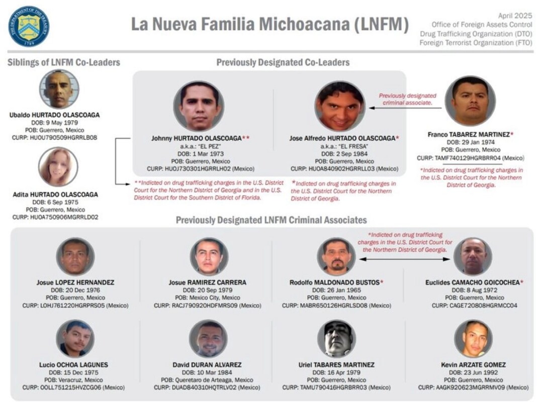 El Tesoro de EU acusó que La Nueva Familia Michoacana es una organización de tráfico de drogas, principalmente establecida en los estados de Guerrero y Michoacán, que ha traficado fentanilo, metanfetamina, heroína y cocaína a los Estados Unidos, y que ha lavado las ganancias de esas drogas ilícitas a través del sistema financiero estadounidense.