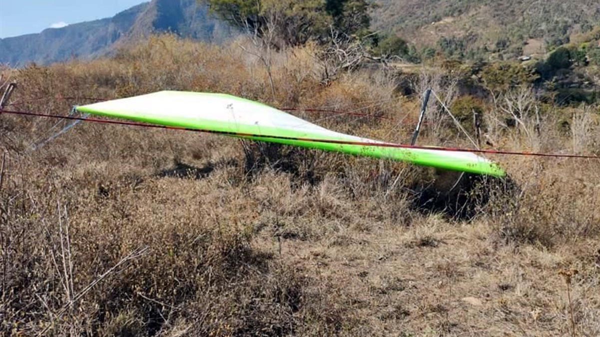 El malogrado piloto de ala delta, identificado como Sean Marmion, presuntamente tomaba clases en este artilugio volador en Temascaltepec Estado de Mexico, cuando una pérdida de sustentación lo precipitó al suelo en una zona conocida como El Peñón.