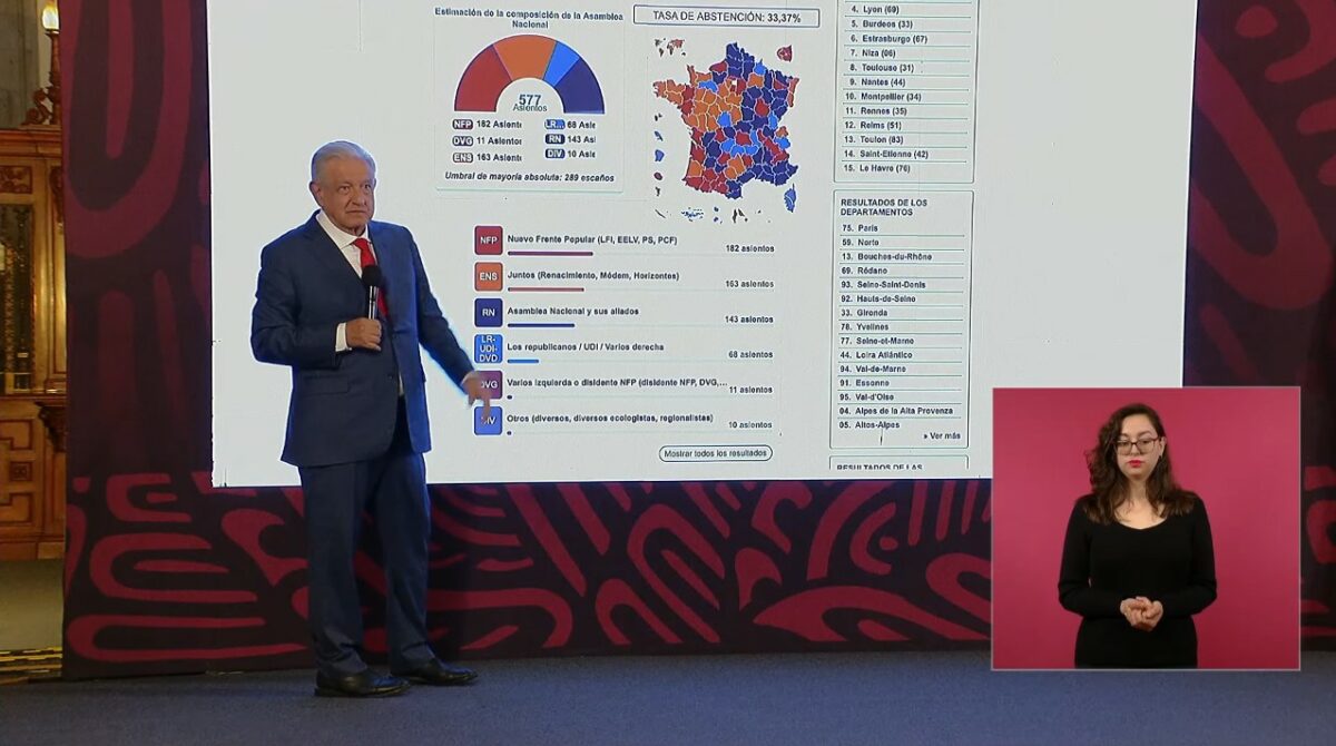 El presidente Andrés Manuel López Obrador manifestó su gusto por el triunfo de la coalición de izquierdas Nuevo Frente Popular (NFP) en Francia, que le arrebató a la extrema derecha la mayoría —aunque no absoluta— en la Asamblea Nacional (cámara baja).