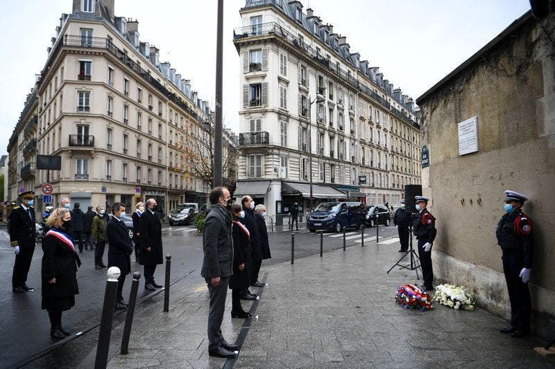 Castex se dirigió primero al Stade de France, donde el ataque comenzó con explosiones suicidas fuera del estadio durante un partido de fútbol al que asistía el entonces presidente, Francois Hollande. Allí depositó una corona de flores al pie de una pared.