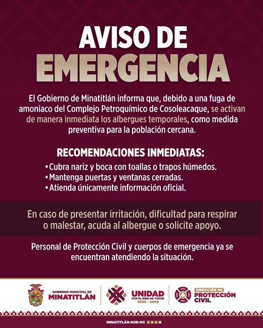 De acuerdo con información emitida por el Gobierno de Minatitlán, a través de su Dirección de Protección Civil, la detección del escape del químico derivó en el cierre temporal de accesos en los alrededores del complejo petroquímico, con el objetivo de garantizar condiciones seguras para las maniobras de atención y evitar la exposición de la población al gas.
