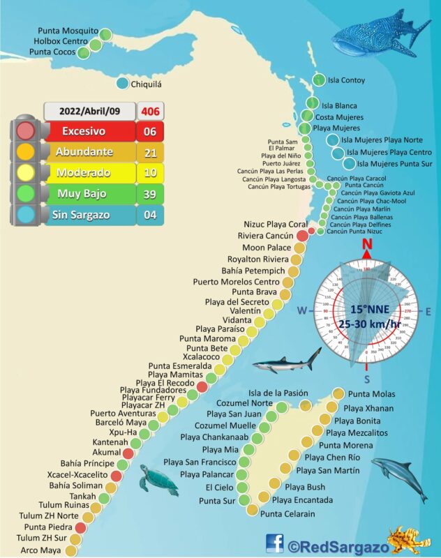 La zona norte de Cancún, Isla Mujeres, Costa Mujeres, Playa Mujeres, Isla Contoy, Holbox, costa oeste de Cozumel y algunos puntos de la Riviera Maya, con muy poco sargazo, otro más con sargazo moderado.