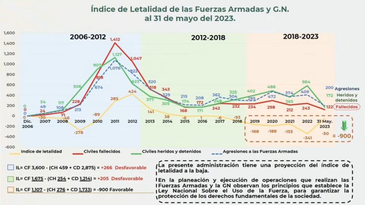 Recordó que la violencia del Estado creció en el pasado, como lo demuestra el hecho del alto nivel de letalidad en los enfrentamientos que se registraban durante el gobierno de Calderón, cuando eran más el número de muertos que los heridos y detenidos, pues la consigna era rematar a los heridos y ahora es al revés, hay más detenidos y heridos que muertos