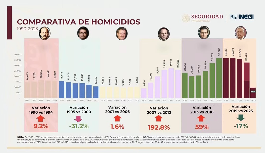 Ante las críticas de que su gobierno es el que más homicidios ha registrado en la historia, el presidente Andrés Manuel López Obrador reconoció que ha costado mucho trabajo romper la inercia creciente del país para reducir este delito porque nos dejaron un país en “decadencia ni siquiera era una crisis”. Si sumamos los homicidios de los sexenios de Enrique Peña Nieto y Felipe Calderón, si es más, pero fue justo en esos sexenios cuando se conformaron y crecieron las bandas del crimen organizado.
