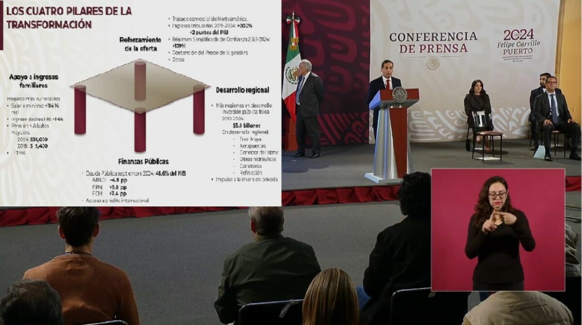 Finalmente, en cuanto al equilibrio de las finanzas públicas, Ramírez de la O destacó que la deuda pública se mantiene estable a septiembre de 2024 con 48.6% del PIB, cifra con la que terminará el sexenio el presidente López Obrador.