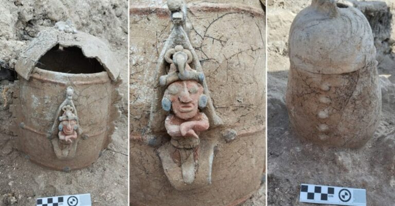 Dentro de las labores de salvamento arqueológico que lleva a cabo el Instituto Nacional de Antropología e Historia (INAH), en las obras del Tramo 7 del Tren Maya, especialistas localizaron una urna funeraria con la representación del dios del maíz.