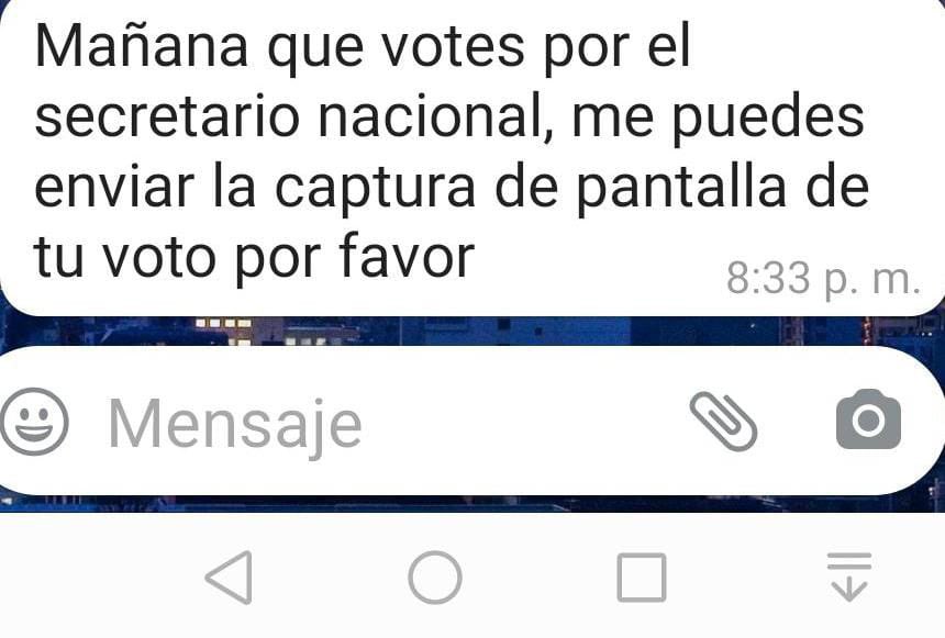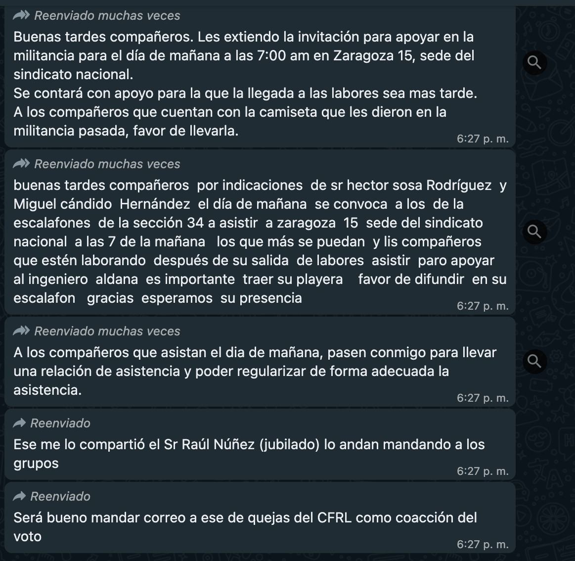Inconformes han difundido por WhatsApp y redes sociales capturas de pantalla y audios en los que se les obliga a apoyar a Ricardo Aldana, así como acudir al sindicato con playeras, gorras, entre otras prendas, alusivas a dicho candidato oficial, apoyado por el grupo de Manuel Limón y cercano al propio Deschamps.