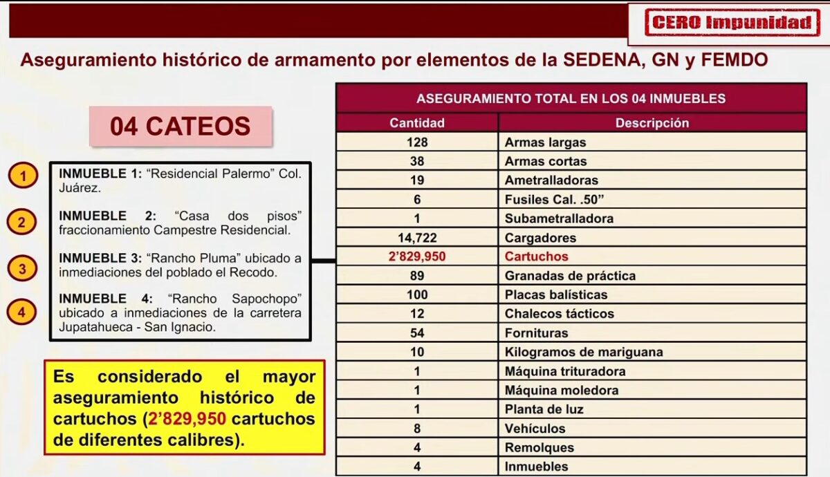 El funcionario dio a conocer el mayor aseguramiento de cartuchos en la historia del país con 2 millones 829 mil 950 balas de diferentes calibres encontrados en Navojoa, Sonora, durante el cateo de cuatro inmuebles realizado por elementos de las Fuerzas Armadas. Además, se encontraron ametralladoras, fusiles calibre .50 y cargadores.