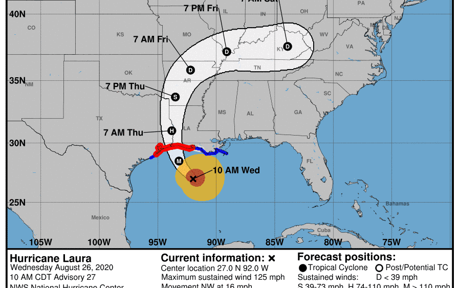 Hurricane-force winds are expected tonight in portions of the hurricane warning area from San Luis Pass, Texas, to west of Morgan City, Louisiana, with catastrophic wind damage expected where Laura’s eyewall makes landfall. More info: https://t.co/tW4KeFW0gB #Laura pic.twitter.com/HPGWHi0M4s