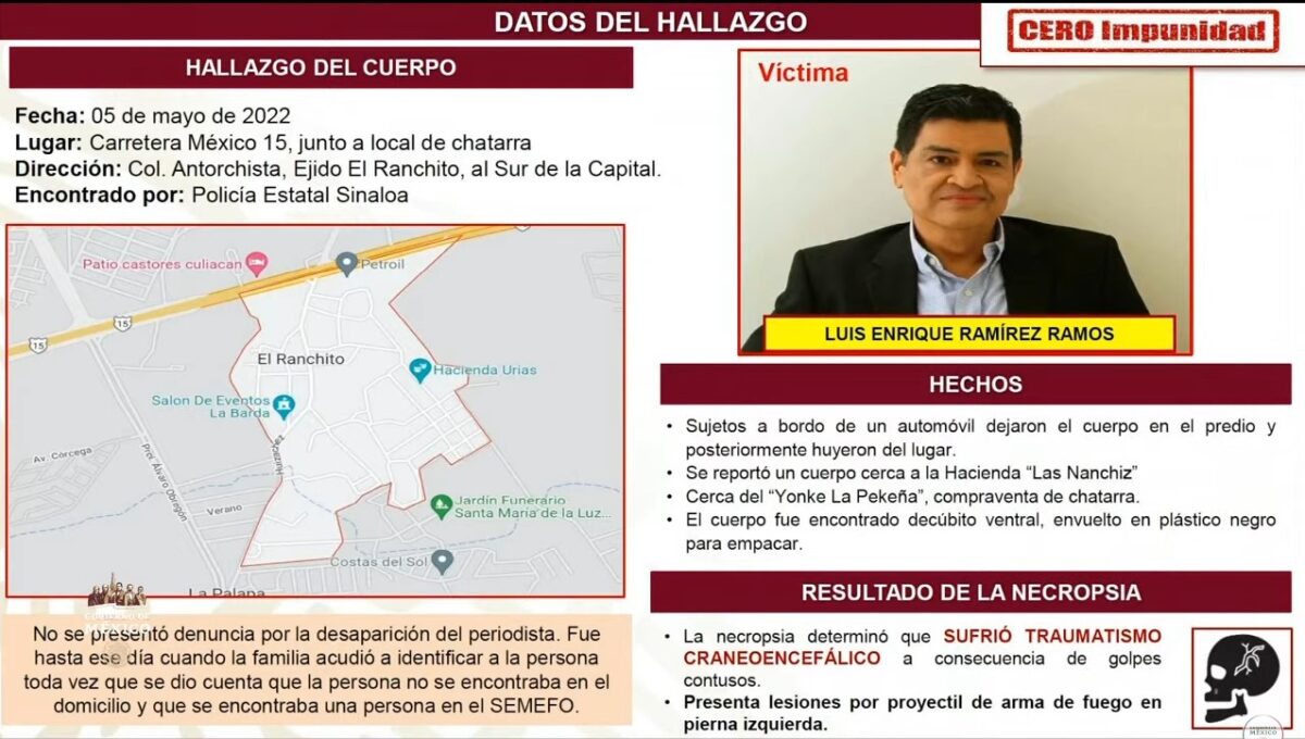 Luis Enrique Ramírez Ramos (Sinaloa, 5 de mayo de 2022). Se constituyó un grupo interinstitucional de la Secretaría de Seguridad Pública en Culiacán para apoyar las investigaciones de la Fiscalía estatal. No se descarta ninguna línea de investigación en el homicidio. Al momento están identificados los presuntos responsables.