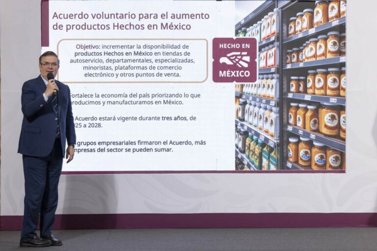 La presidenta Claudia Sheinbaum firmó el pasado 14 de mayo el “Acuerdo voluntario para el aumento de contenido nacional” con 22 grupos empresariales, cuyo objetivo es incrementar la disponibilidad de productos hechos en México en tiendas de autoservicio, departamentales, especializadas, minoristas, plataformas de comercio electrónico y otros productos de venta.