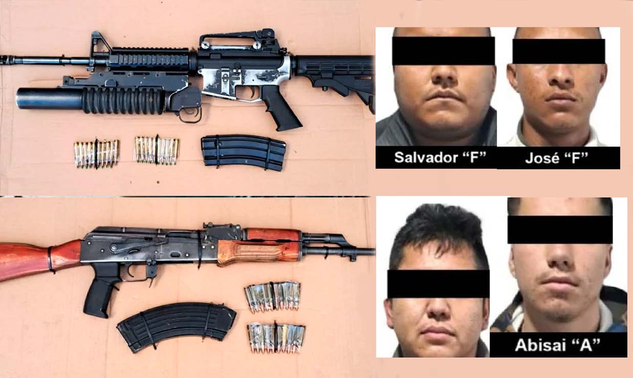 Los detenidos fueron identificados como Elías “B”, Abisai “A”, José “F” y Salvador “F”, quienes enfrentarán cargos por los presuntos delitos de portación ilegal de armas de fuego, cargadores y cartuchos exclusivos para el uso de las Fuerzas Armadas.